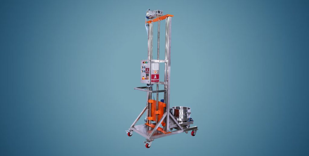 This lightweight motorized fork lifter is designed to lift loads up to 200 kg, eliminating manual effort during rice/dal loading. With smooth up-down and tilting movements (up to 180°), it ensures easy transfer into grinders and batter packing machines, improving efficiency in high-capacity production.b